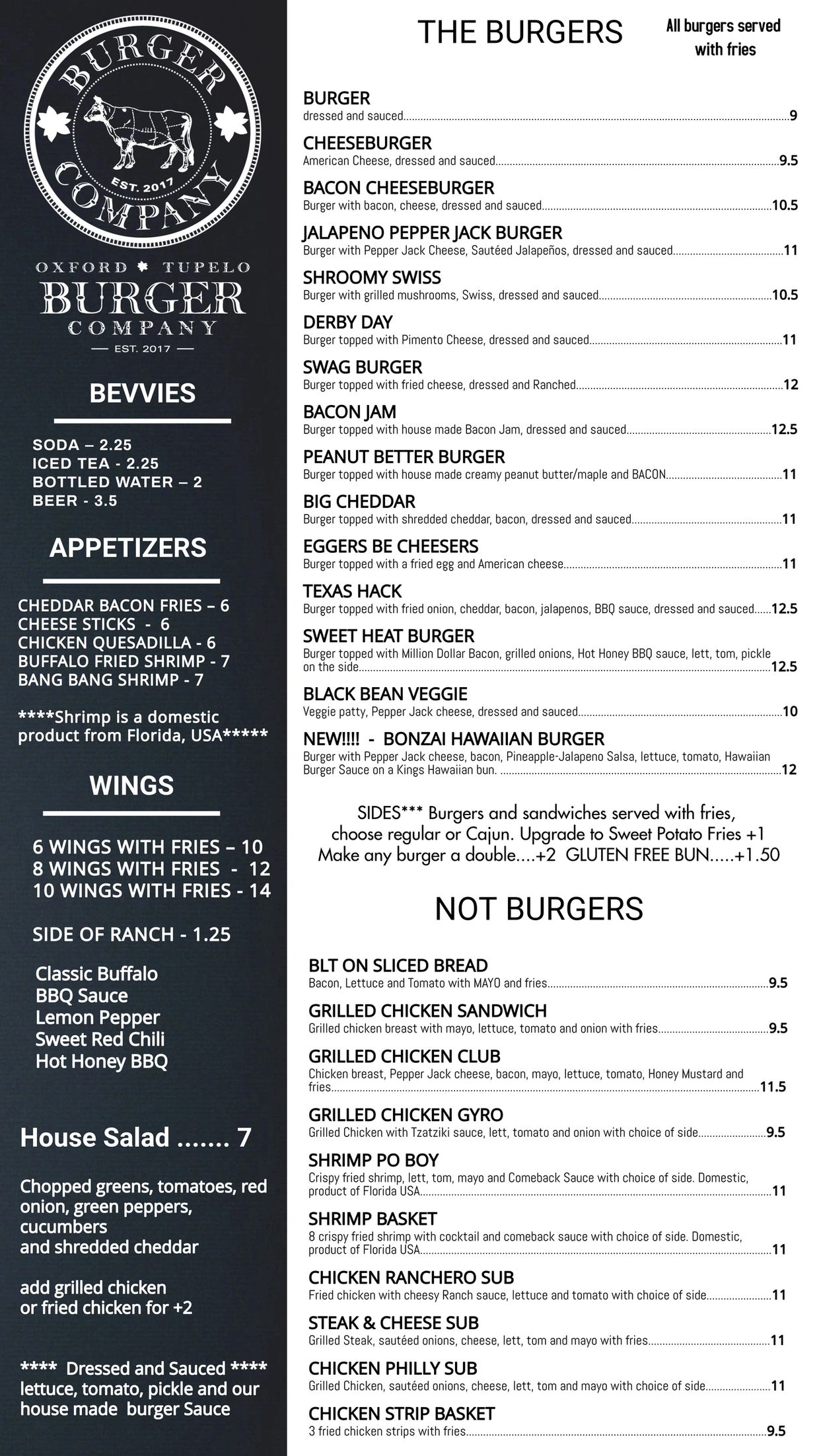 Tupelo Burger Co Menu, MOD BURGER Menu, Burgers Tupelo MS